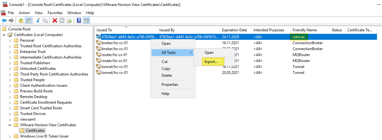 I log in on my Connection Server and launch the Certificates MMC, export the certificate from the VMware Horizon Certificates\Certificates folder