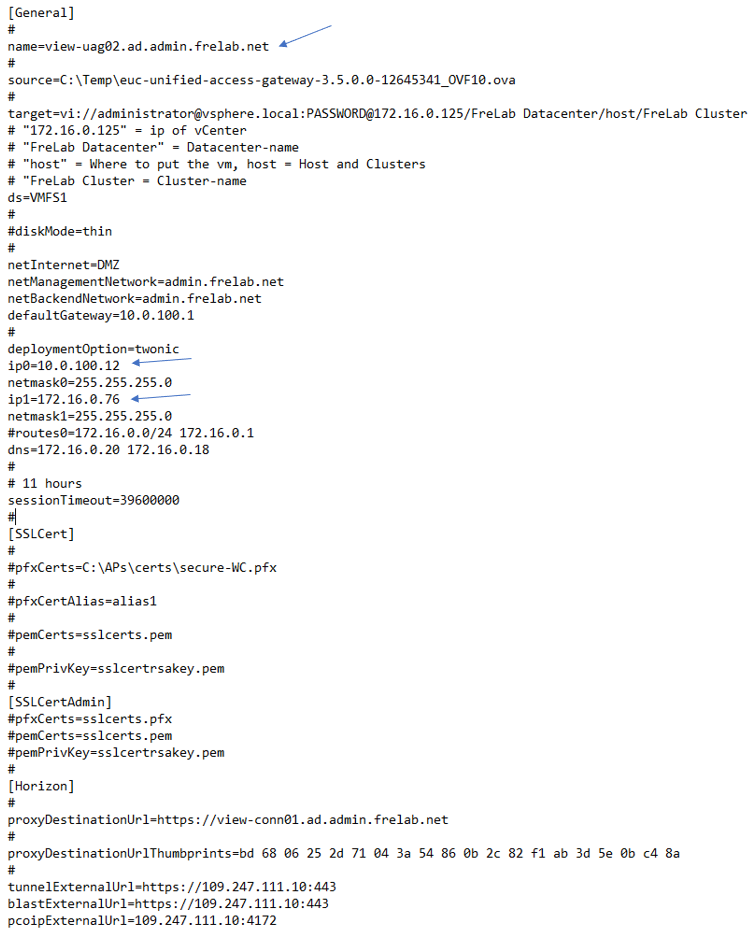I make a copy of my existing ini-file and edit it prior to deploying a new UAG. As I mentioned previously, although I originally design and planned for a 3 nic deployment, I will only use two nics due to the fact that I don’t have a management VLAN/PG in my lab.