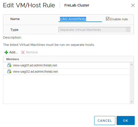 In vSphere, I create an anti-affinity rule to make sure my UAG’s are newer on the same host