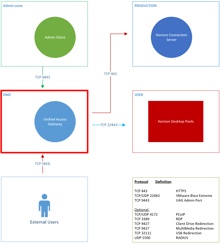 Before I can start deploying a UAG, I will need to do some planning and designing. I have done a High-level design and a low-level design, below. In my setup I will be deploying UAG HA with 3 vmnics in each UAG. There will be load balancers both in DMZ and in production. As I will be using this setup for Horizon, I check with VMware Tech Zone which ports to open in firewall: Network Ports in VMware Horizon 7
