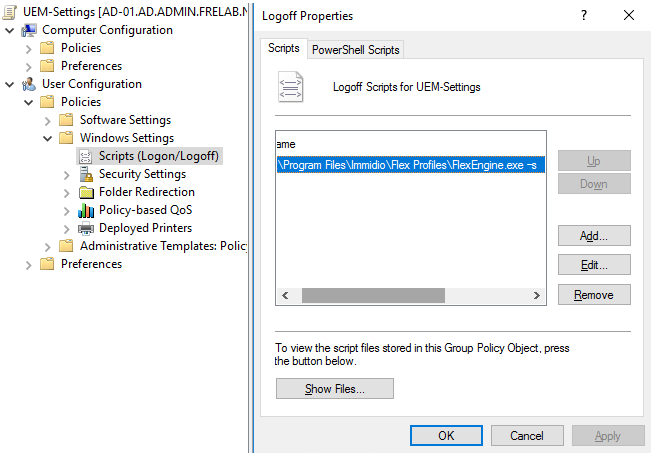Finally, I configure the UEM FlexEngine logout command to run from a logout script. This way, the personal settings for the users are exported at logout.