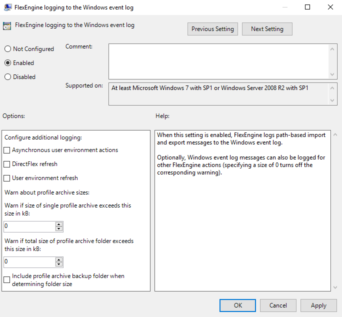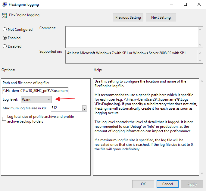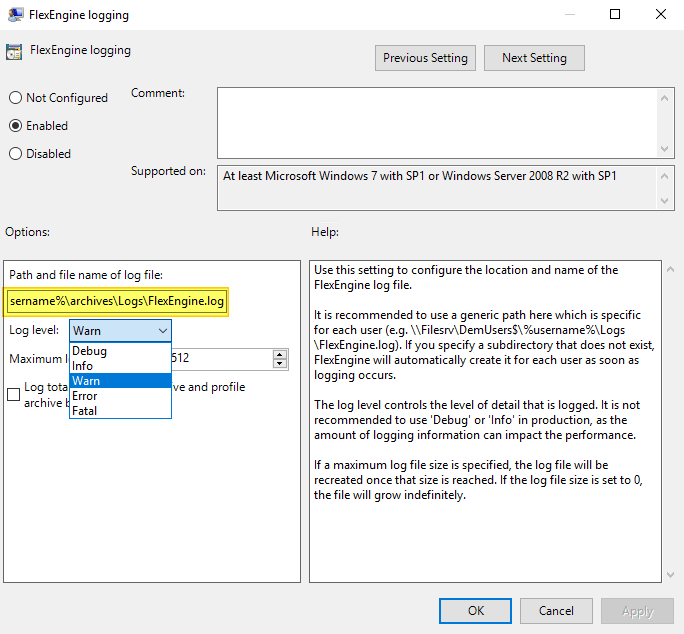 It is recommended to point this log location to the same location as the DEM profile, which I have done here. If I need to debug, I can change the Log Level to Debug. Although, changing this setting to Debug, would result in a debug of all users who are using this GPO with their DEM agent, not always necessary. To debug a single users issues, using the Flexdebug.txt method discussed below, would be preferable.
